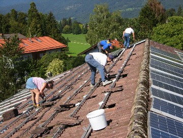 Unter tatkräftiger Mithilfe von Peter Hauber wurden von der Fa. Salzeder die von Schnee und Eis des vergangenen Winters verursachten Schäden beseitigt. Dabei wurden auch alle Dachziegel, auf denen die Konstruktion aufliegt, durch Aluminium-Dachziegel ersetzt. Deshalb mussten alle 98 Module abmontiert, seitlich gelagert und am Schluss wieder aufmontiert werden; dennoch konnten die Arbeiten an einem Tag beendet werden.