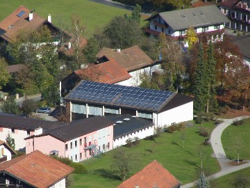 In die Luft gingen die Vorstände Peter Hauber und Franz Sicklinger im September; sie wollten nämlich "ihre" Fotovoltaikanlage einmal von oben sehen. Zu diesem Zweck unternahmen sie einen Gleitschirmflug mit einem Tandemgleitschirm vom Hochschlegel nach Bayerisch Gmain. Peter Hauber fungierte dabei als Pilot, Franz Sicklinger als Fotograf und Kameramann. Der Ausflug hat sich gelohnt, die Aussicht auf den Ort und insbesondere die Fotvoltaikanlage eine schöne Sache!