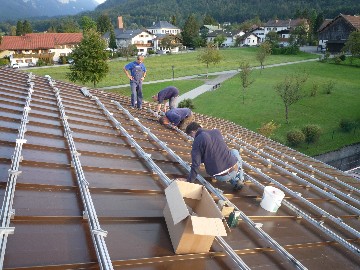 Am Freitag, 17.10. stiegen die Fa. Salzeder und die Vorstände Hauber und Sicklinger der Schulturnhalle wieder einmal aufs Dach, um die 32 Module der zusätzlichen 5. Reihe zu montieren. Bei dieser Gelegenheit wurden auch die Dachziegel, auf denen die Halterungen aufliegen, durch Aluminium-Ziegel ersetzt. Auch ein weiterer Wechselrichter wurde installiert.