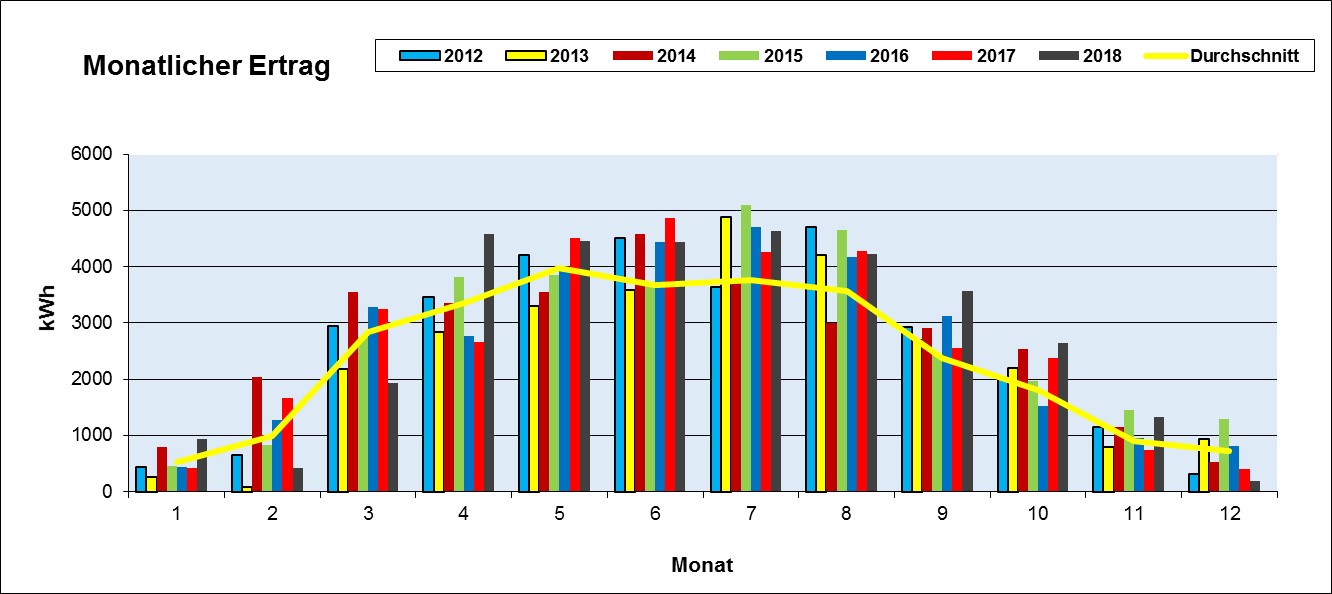 Im folgenden Diagramm sind die Stromerträge der letzten 7 bzw. 6 Jahre in kWh im Jahresverlauf grafisch dargestellt.